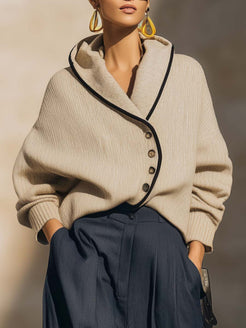 Indulge in the elegance of our Temperament And Comfortable Lapel Slant Front Button Beige Knitted Cardigan. This exquisite piece effortlessly combines style and comfort, making it an essential addition to your wardrobe. Crafted with a soft knit fabric, the cardigan features a sophisticated beige hue that complements various outfits.