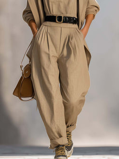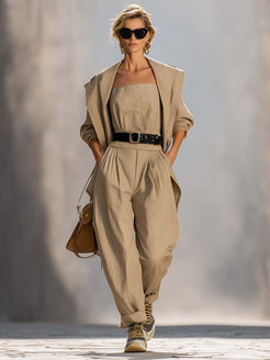 The Temperament And Fashion Khaki Off-the-shoulder Belted Jumpsuit And Outerwear Set is a chic and sophisticated ensemble that exudes elegance. This set includes an off-the-shoulder jumpsuit that perfectly accentuates the collarbones and shoulders, paired with a stylish outerwear piece in matching khaki tones. It is designed for those who appreciate a blend of classic charm and contemporary flair.