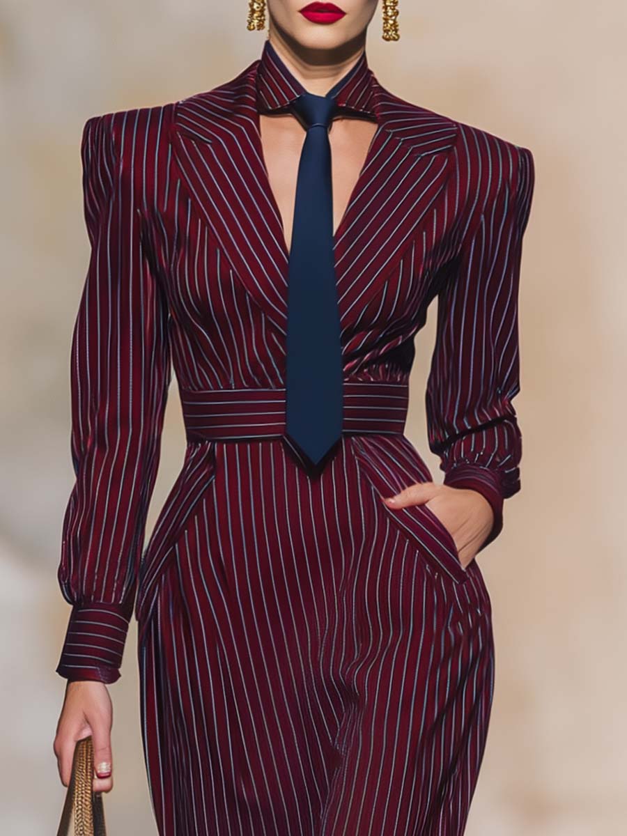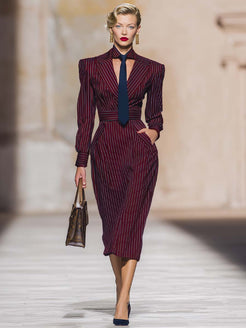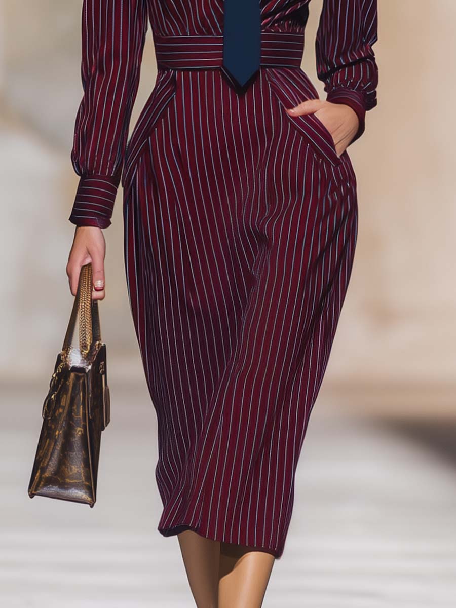 This Temperamental And Fashionable High-quality V-neck Long-sleeved Tie Burgundy Striped Midi Dress is a perfect statement piece for any wardrobe. With its striking burgundy color and elegant striped design, it combines timeless sophistication with contemporary style.
