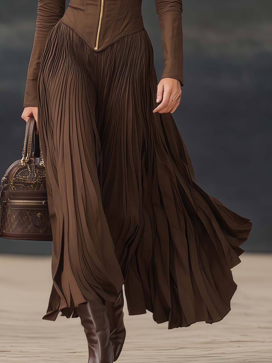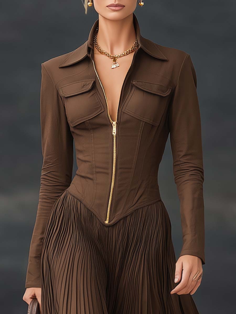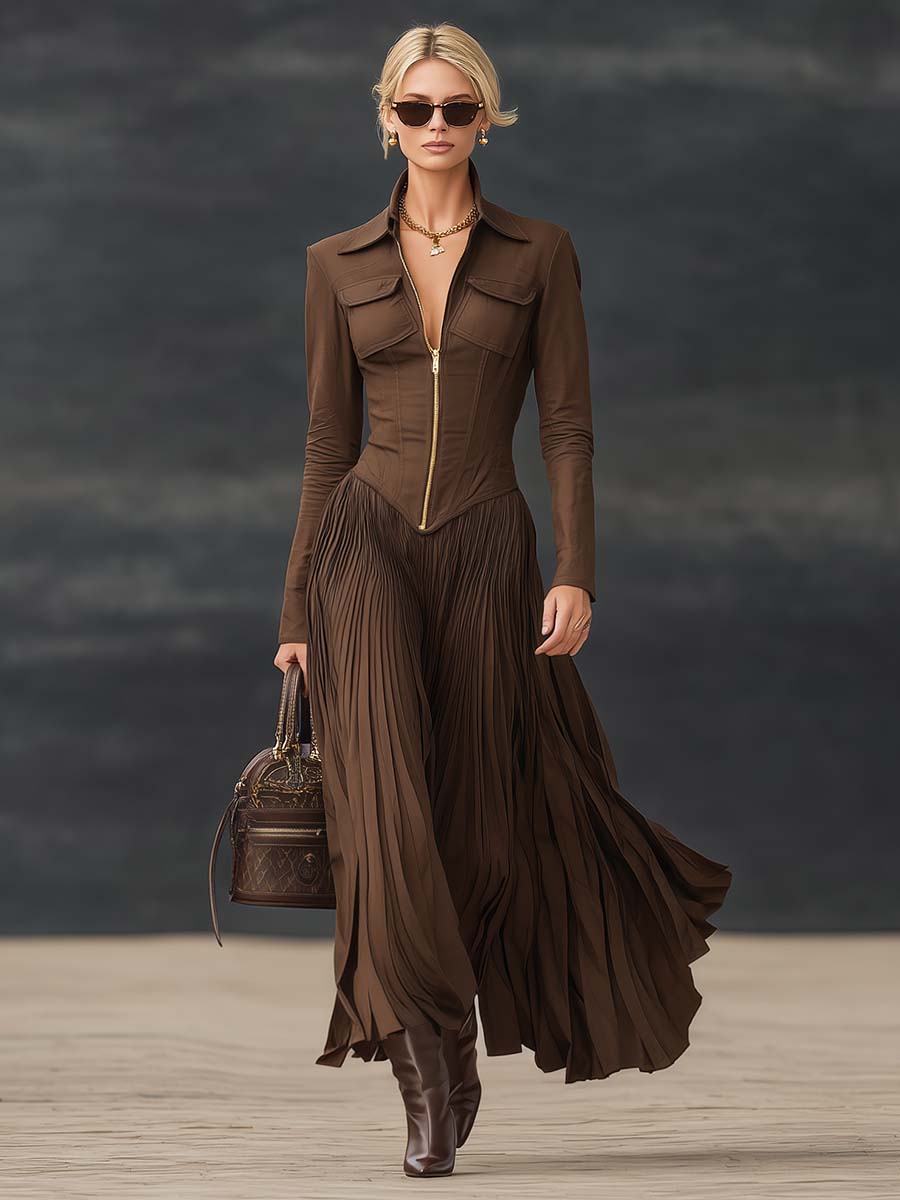This elegant brown cotton maxi dress embodies a contemporary twist on classic urban chic. With its refined lapel collar and modern front zipper design, it effortlessly blends sophistication and comfort. The pleated hem offers a unique silhouette, adding a touch of playful movement to your stride.