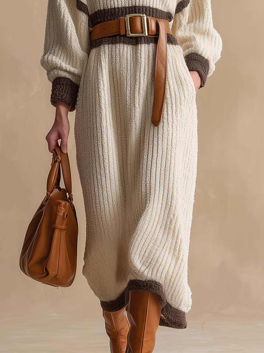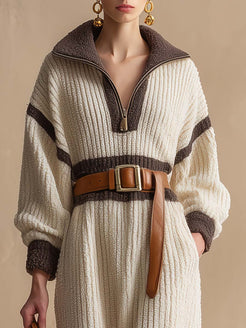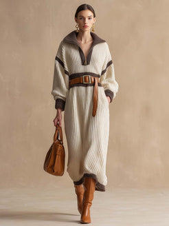 Introducing the Temperament Fashion And Comfort Contrast Lapel Cream Color Ribbed Knitted Midi Dress, a perfect blend of modern style and cozy comfort. This versatile piece beautifully combines a cream color palette with a contrasting lapel, offering a chic and elegant look suitable for various occasions.