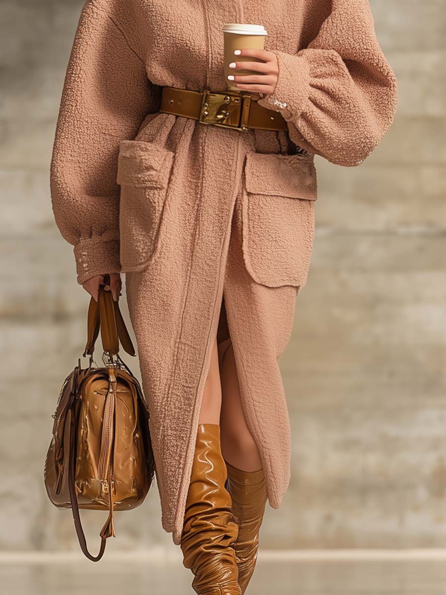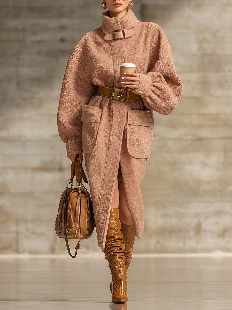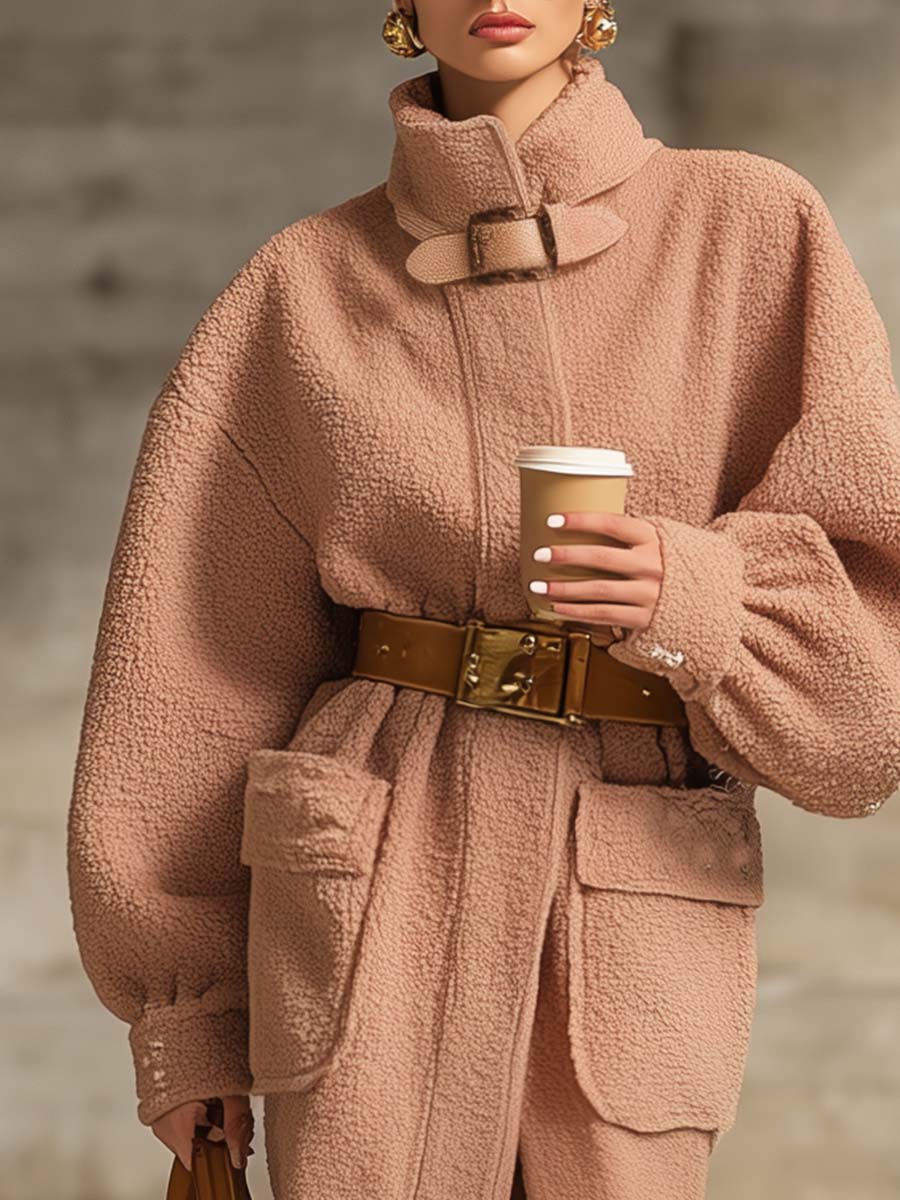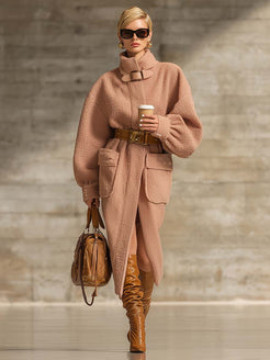 This elegant polar fleece coat combines style and functionality, featuring a unique openable stand-up collar and a chic belt for added flair. Crafted with meticulous attention to detail, it provides the perfect blend of comfort and sophistication, making it ideal for both casual and formal settings.