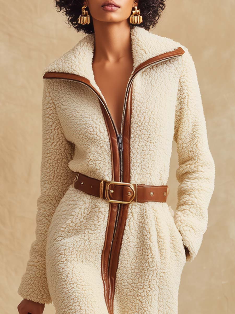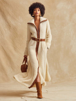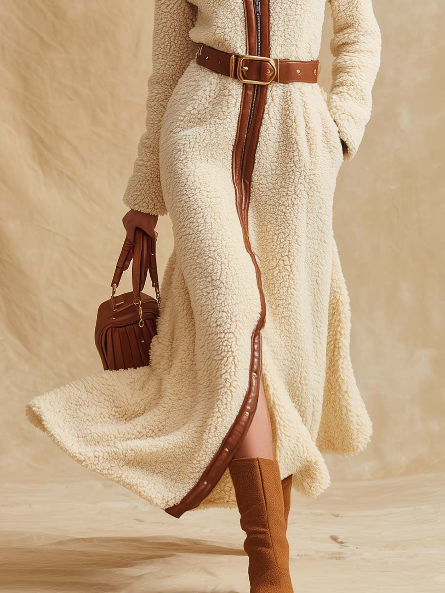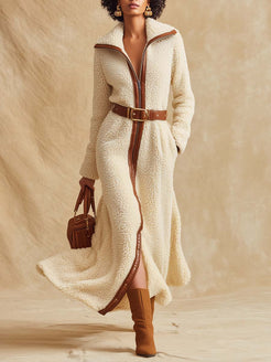 Discover timeless elegance with our Temperament Retro Brown Leather Trim Lapel Front Zipper Cream Fleece Maxi Dress. This dress combines vintage charm with contemporary style, offering a sophisticated yet comfortable look. Crafted from plush cream fleece material, it guarantees warmth and softness, making it an ideal choice for any chilly day.