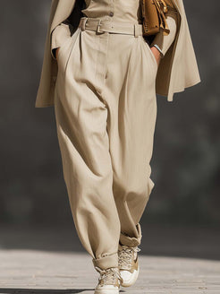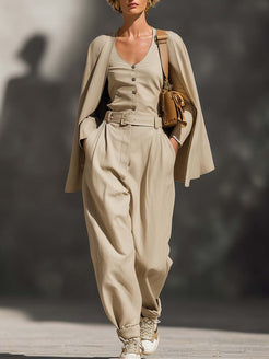 The Temperament Street Urban Beige Jumpsuit is a unique, fashion-forward piece that epitomizes modern style. Designed with a sophisticated two-piece look, it seamlessly combines elegance with a hint of urban flair. The shawl-style V-neck adds an extra layer of chic, while the front buckle belt cinches the waist, creating a flattering silhouette. This jumpsuit is ideal for those who seek both comfort and trend-setting fashion.