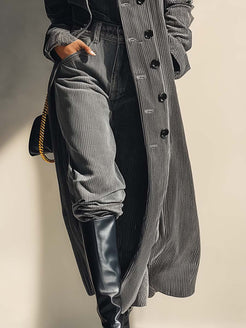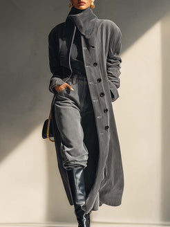 The Temperament Street Urban Openable High Collar Front Button Gray Corduroy Coat is a versatile and stylish piece designed for modern women who appreciate both sophistication and practicality. Made from premium corduroy fabric, this coat offers a luxurious tactile feel and a timeless gray hue that effortlessly complements any outfit.