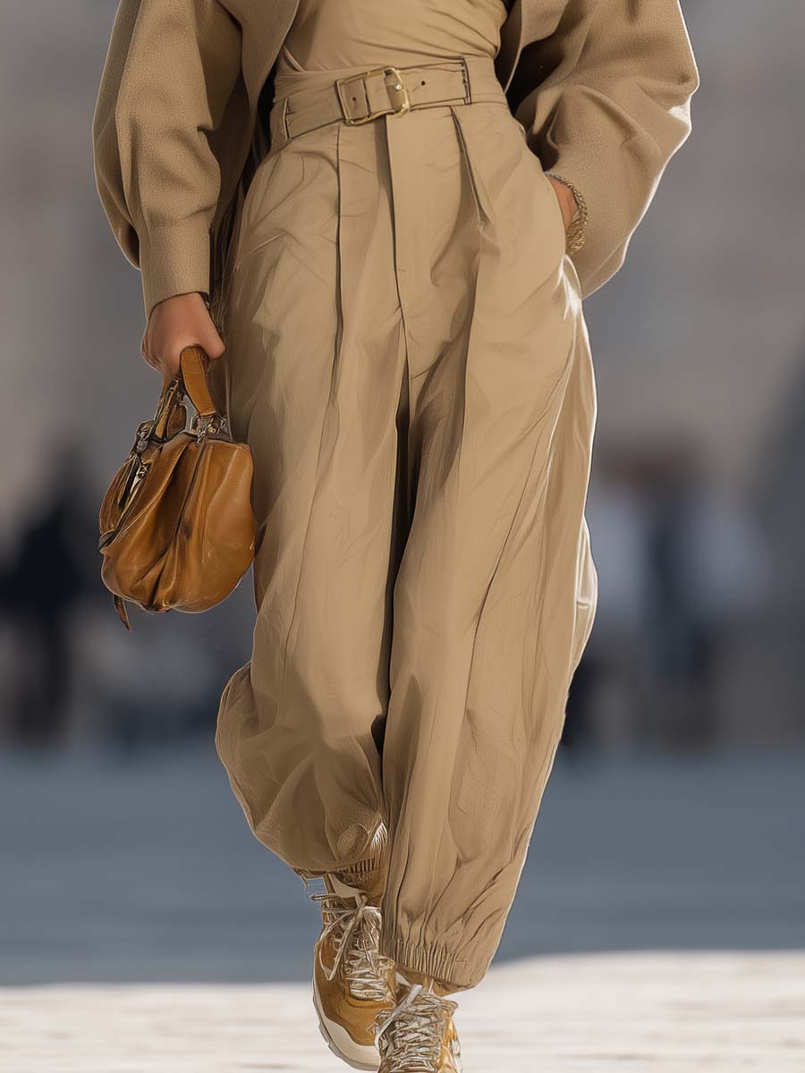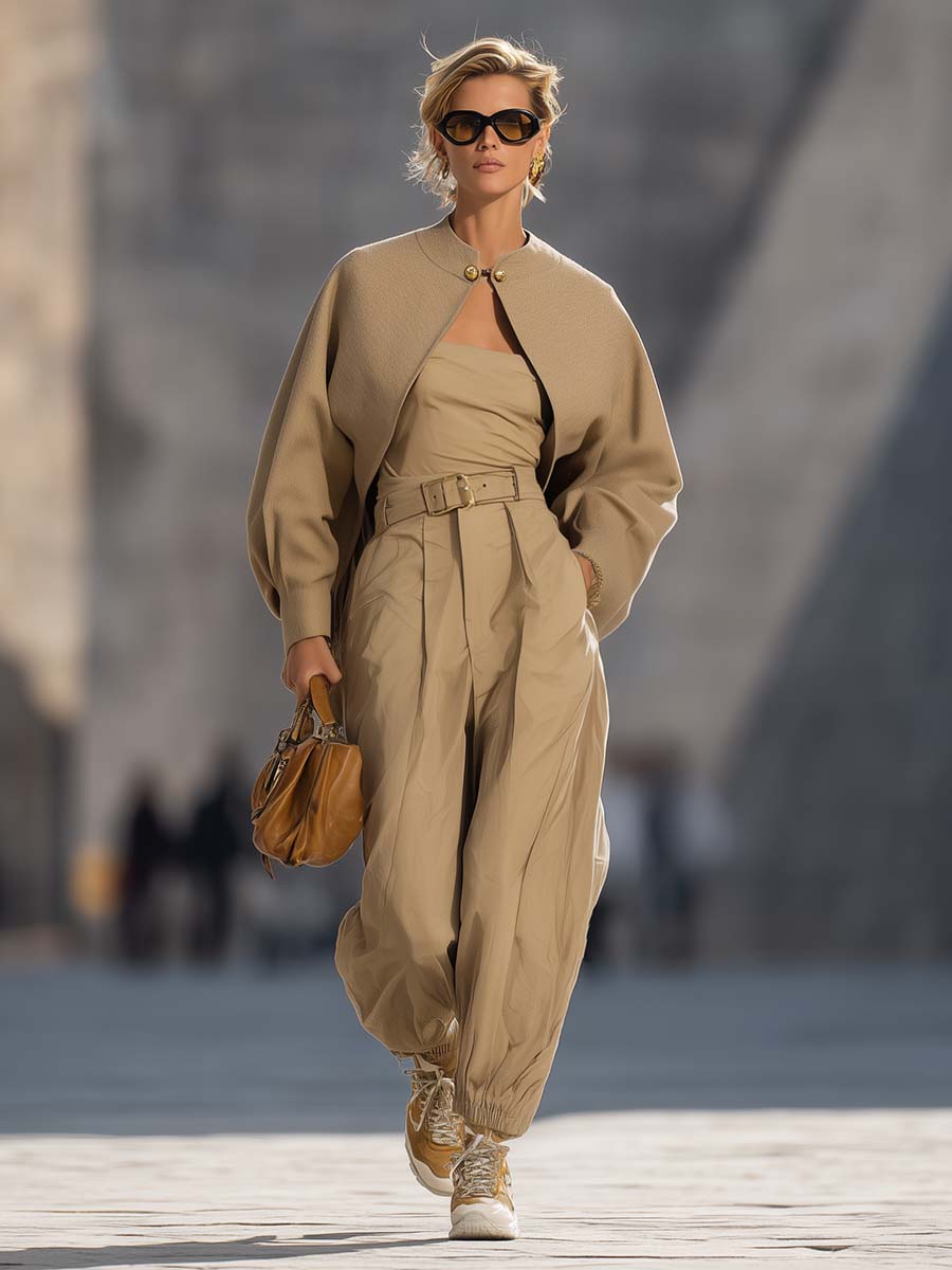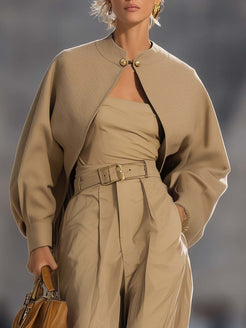 This sophisticated ensemble features a Temperament Urban Khaki Bat-sleeve Front-opening Small Jacket paired with an Off-shoulder Belt Jumpsuit. The combination strikes a harmonious balance between elegance and contemporary style, making it an ideal choice for urban fashion enthusiasts.