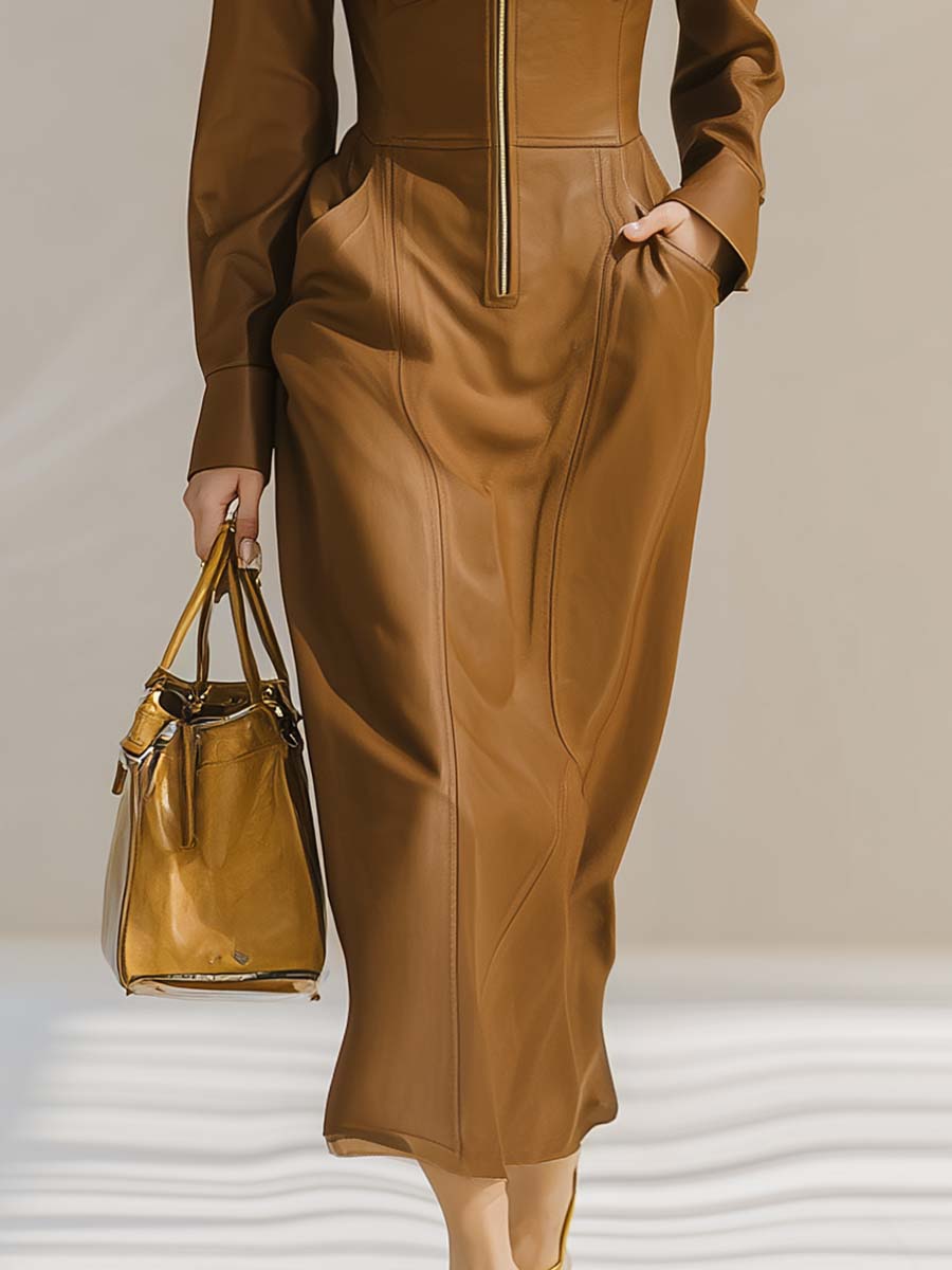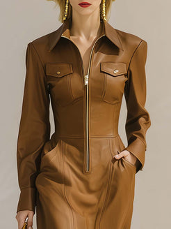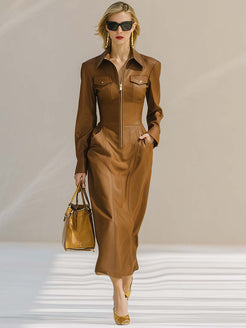 This striking brown leather midi dress perfectly blends modern urban style with classic elegance. With its chic wide shoulder design and distinctive lapel collar, it's crafted to make a bold statement. The sleek front zipper adds a touch of contemporary flair, accompanied by a flattering silhouette that accentuates your curves beautifully.