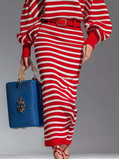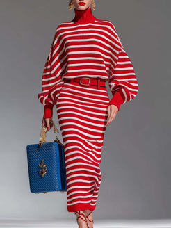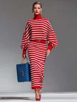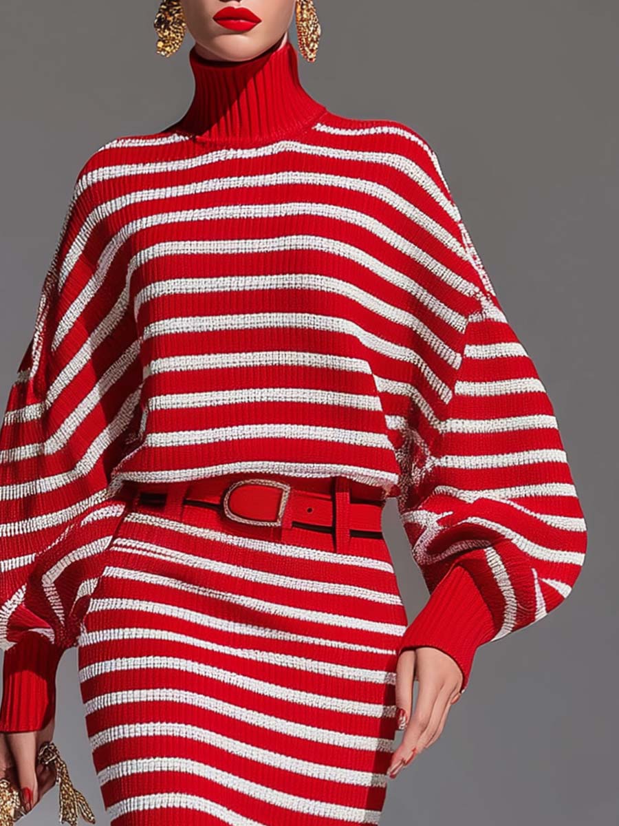 The Temperamental and Fashionable High Collar Batwing Sleeves White and Red Striped Knitted Maxi Dress is a chic and contemporary statement piece. This dress is meticulously designed with a high collar and batwing sleeves, enhancing its distinctive and modern look. The iconic white and red stripe pattern adds a bold and fashionable touch, making it perfect for various occasions.