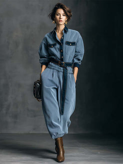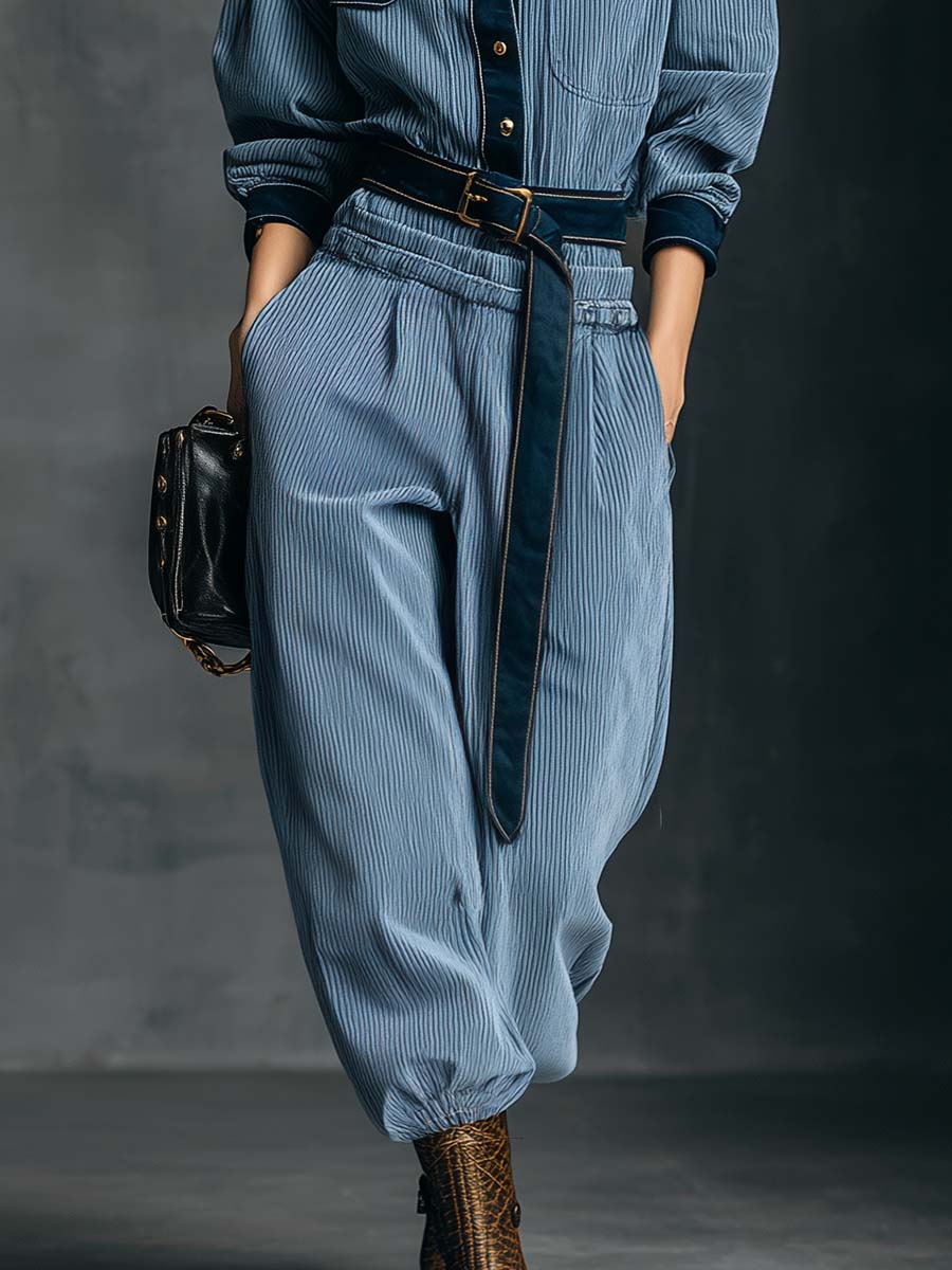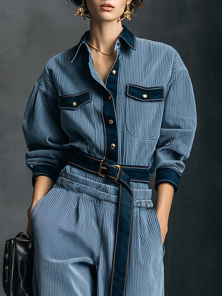 The Temperamental and Fashionable Retro Dark Blue Satin Trim Light Blue Wick Front Button Top and Pants Set represents a perfect blend of vintage aesthetics with a modern twist. Crafted from premium quality fabrics, this set offers a comfortable yet stylish fit that will surely turn heads.