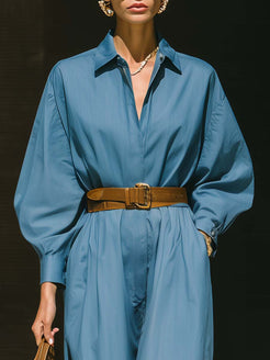 The Temperamental And Fashionable Street Bat Sleeve Belt Blue Shirt-style Jumpsuit effortlessly combines contemporary style with casual sophistication. The jumpsuit is designed in a soothing blue hue, capturing a sense of elegance and calm. The shirt-style design introduces a smart, polished look, suitable for both everyday wear and special occasions.
