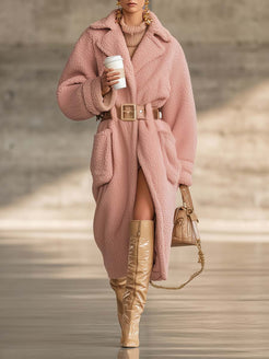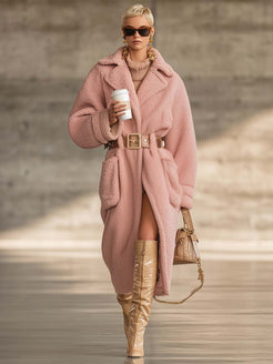 This urban-style pink polar fleece coat features a trendy large lapel and functional pockets, combining style with utility. The coat's soft texture and vibrant hue make it a statement piece, perfect for fashion-forward individuals looking to make a bold impression.