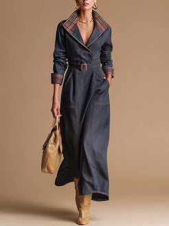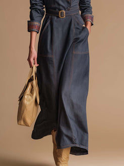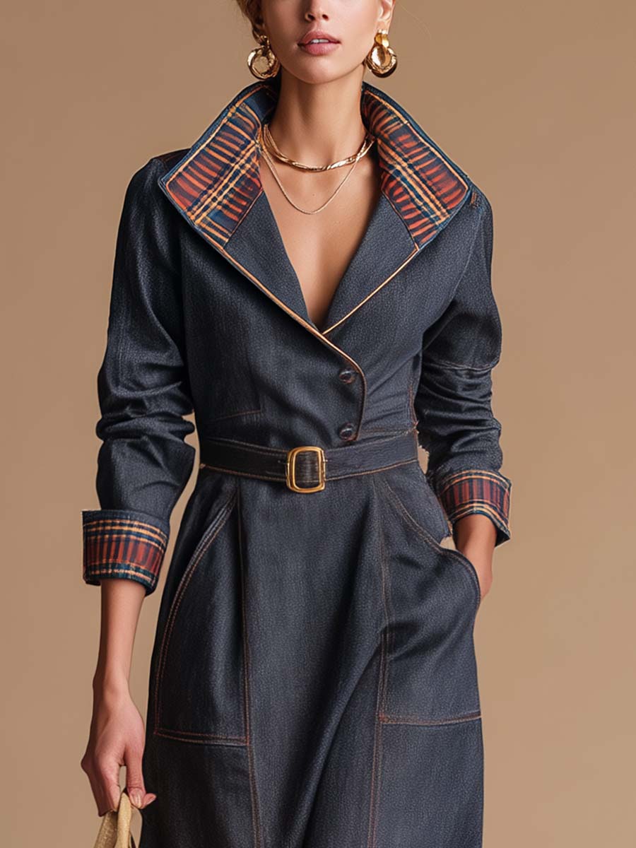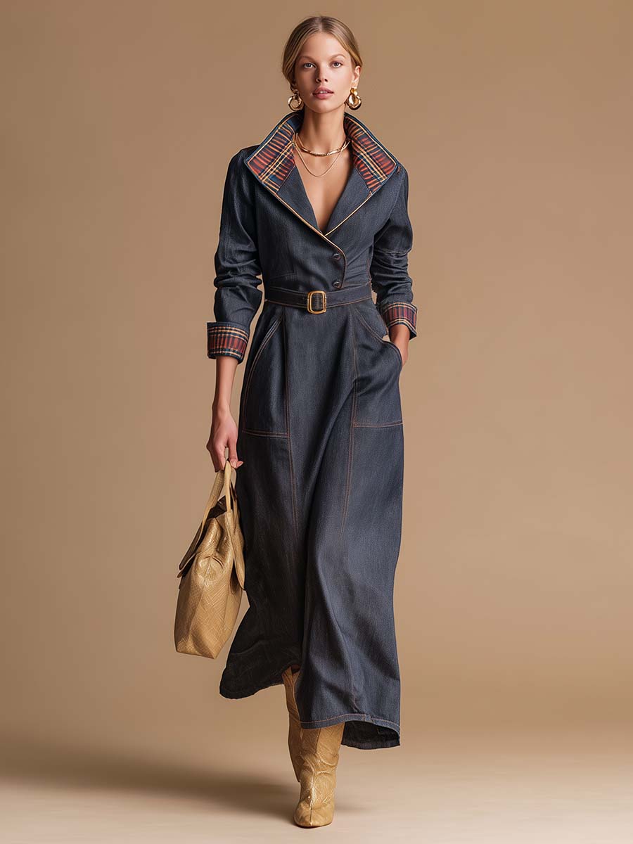 The Temperamental Fashion Retro Blue And Red Plaid Large Lapel Front Button Dark Blue Denim Maxi Dress blends the classic charm of retro style with modern elegance. This dress features a striking blue and red plaid pattern that contrasts beautifully with the deep blue denim fabric, creating a timeless and vibrant look.