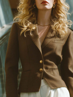 Introducing the Urban Retro Exquisite Flat Lapel Single-breasted Two-button Brown Imitation Wool Short Blazer, a sophisticated blend of classic design and modern sensibility. This blazer is crafted to perfection with a flat lapel and a flattering single-breasted silhouette, featuring two functional buttons for a streamlined look. The warm brown hue exudes elegance, making it a versatile piece that complements various styles.