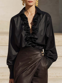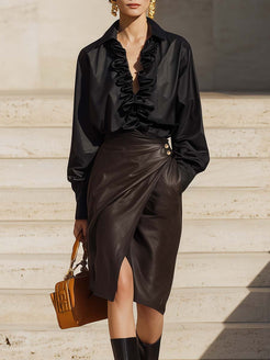 The Urban Temperament Vintage Black Ruffled V-neck Shirt And Leather Skirt Set is a sophisticated ensemble that captures the essence of classic elegance with a modern twist. The set features a stylish black ruffled V-neck shirt that perfectly complements the sleek lines of the accompanying leather skirt.