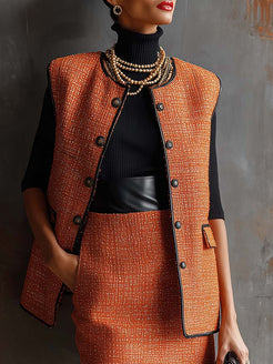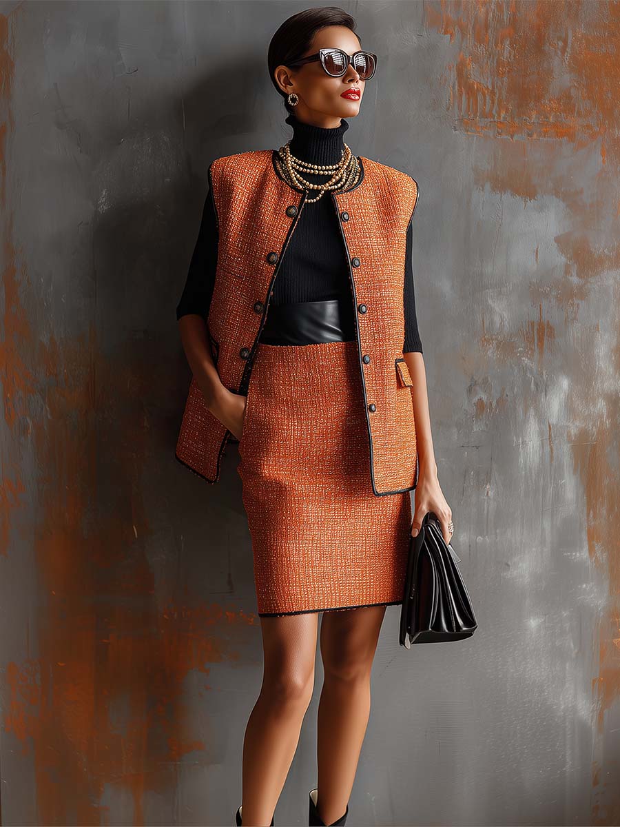 This versatile and fashionable set includes an orange tweed sleeveless jacket and a matching skirt. The set is crafted from high-quality materials and designed to offer both style and comfort, making it suitable for a variety of occasions.