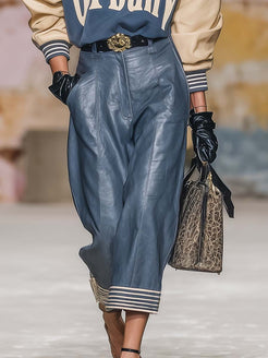 These Versatile Retro Fashion Contrast Striped Hem Blue Leather Cropped Trousers are a remarkable addition to any wardrobe. Crafted from high-quality leather, these trousers feature a unique blend of retro style infused with modern fashion elements. The elegant blue color is perfectly contrasted with striking striped hems, making them a standout piece for any occasion.
