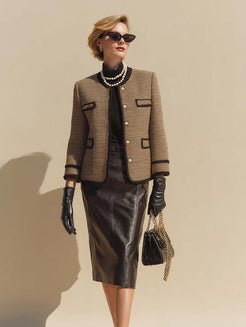 This brown tweed blazer easily pairs well with a skirt or other items for a sophisticated work look. For a more casual look, pair it with a simple turtleneck and jeans. The fitted silhouette and timeless style make it effortlessly versatile for both work and social occasions.