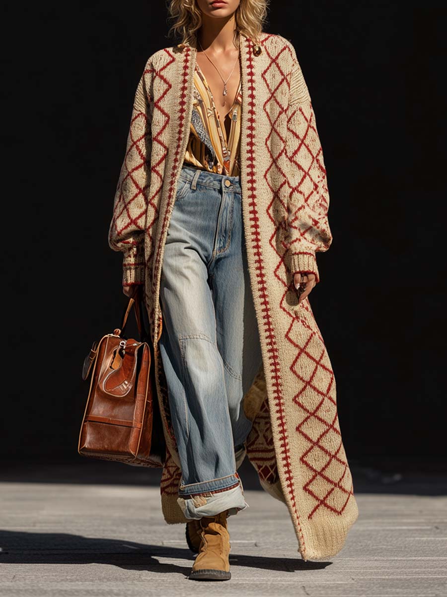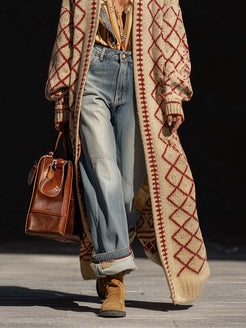 This vintage-inspired cardigan features a loose silhouette and often features details like long sleeves, a diamond pattern, and a classic red and beige colorway, adding a casual touch. You can style it with knee-high boots, jeans, and a shirt, or with sneakers for a casual look. It's versatile, perfect for a day out or a casual get-together with friends.
