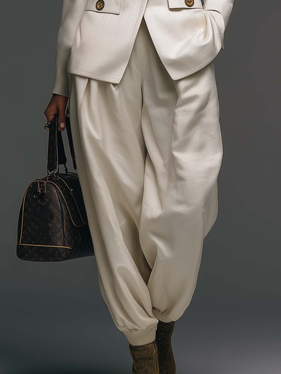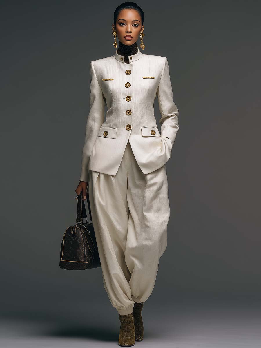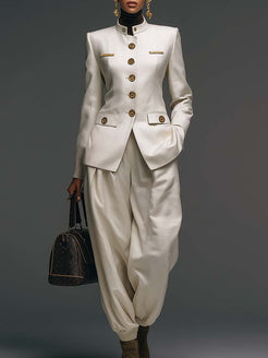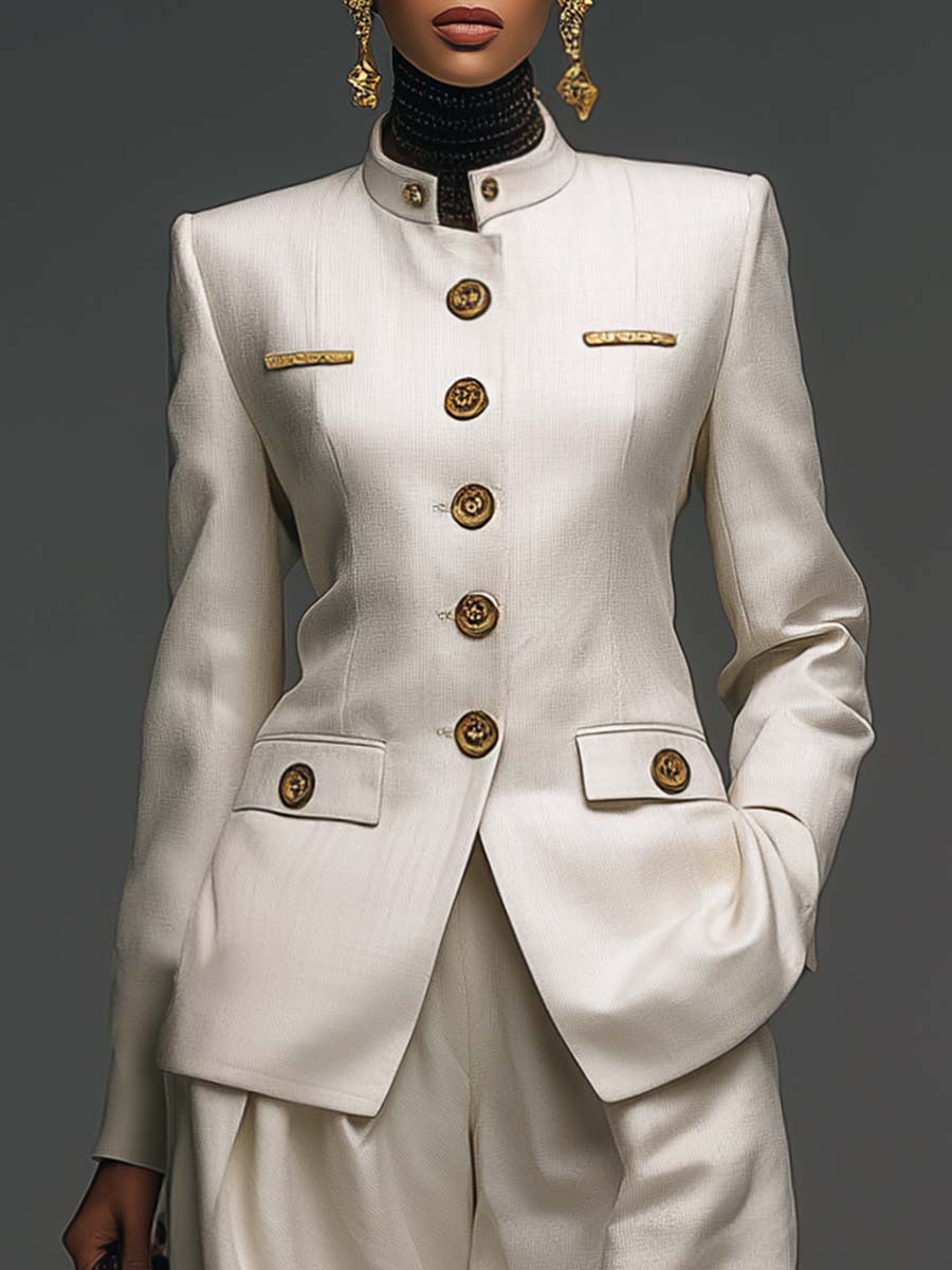 Introducing a timeless and elegant two-piece set featuring a creamy white jacket and tapered pants, meticulously crafted from a blend of cotton and linen. The set exudes a classic vintage appeal, with the small stand-up collar and front button detailing on the jacket enhancing its sophisticated aesthetic.