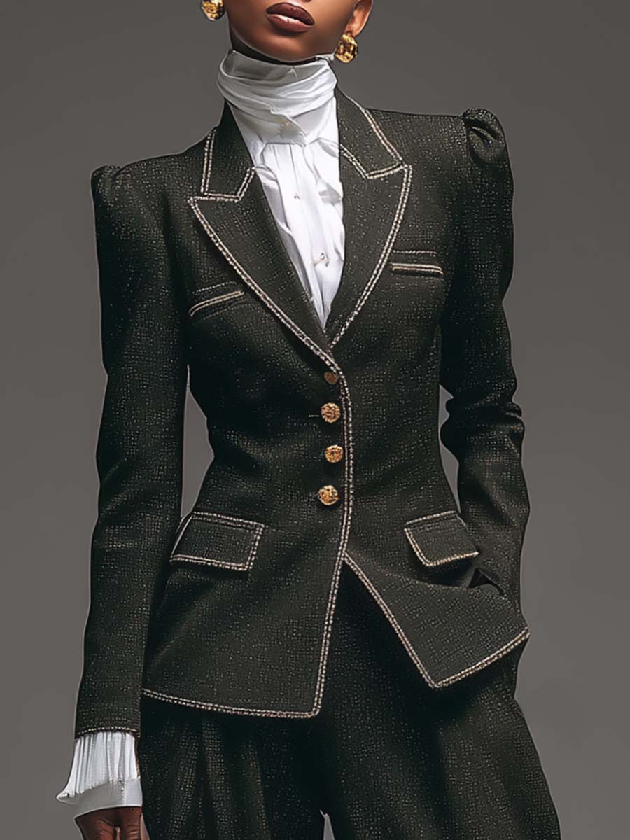 Introducing our Vintage Exquisite Gray Tweed Peak Lapel White Trim Puff Shoulder Blazer and Pants Set - a timeless ensemble destined to make a statement. Crafted from premium gray tweed fabric, this set exudes sophistication and elegance. The standout white trim accentuates the classic peak lapel design, while the puff shoulders add a touch of vintage charm.