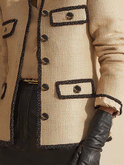 This elegant and sophisticated beige tweed button-down blazer cleverly blends classic design with modern flair. Crafted from premium beige tweed fabric, the collarless beige blazer exudes a vintage-chic vibe, making it a must-have piece to elevate your wardrobe with refined style.
