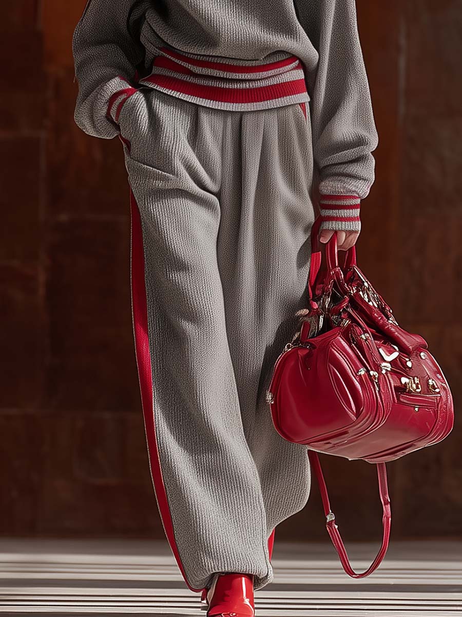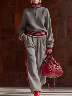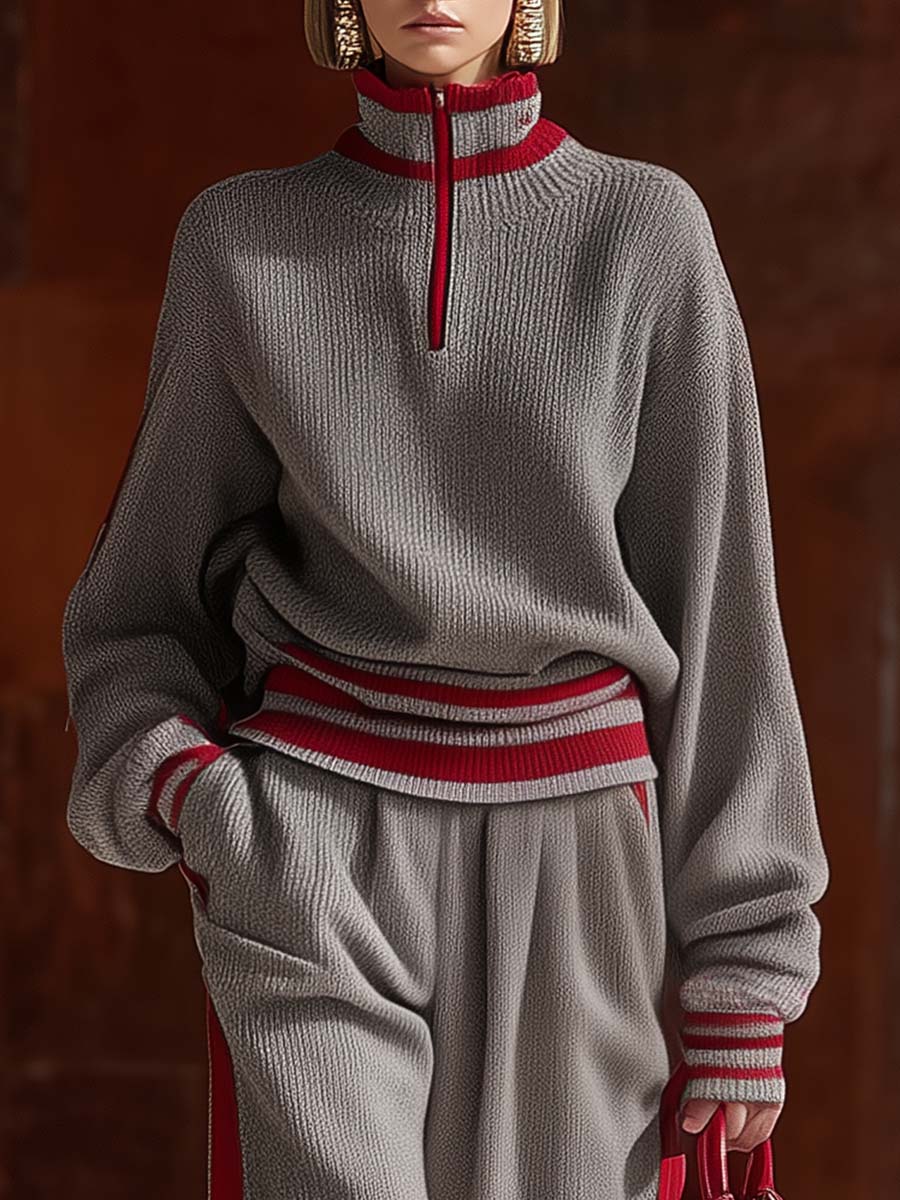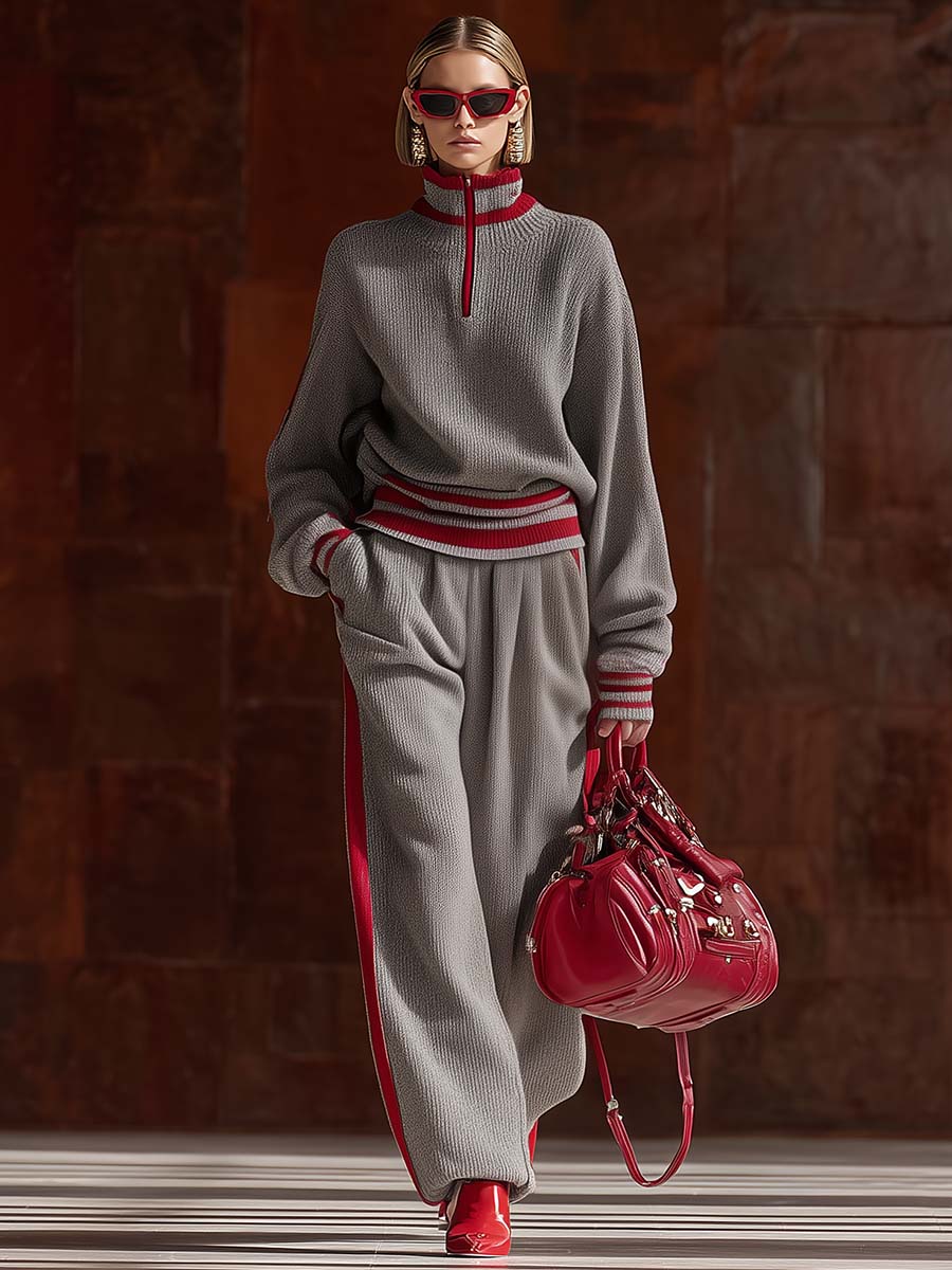 This retro-style tracksuit is crafted from a stylish grey knit for comfort and style. Red striped trim adds a touch of energy to the refined look. The top's high collar and front zipper create a modern feel, perfectly complementing the pants for a cohesive look.