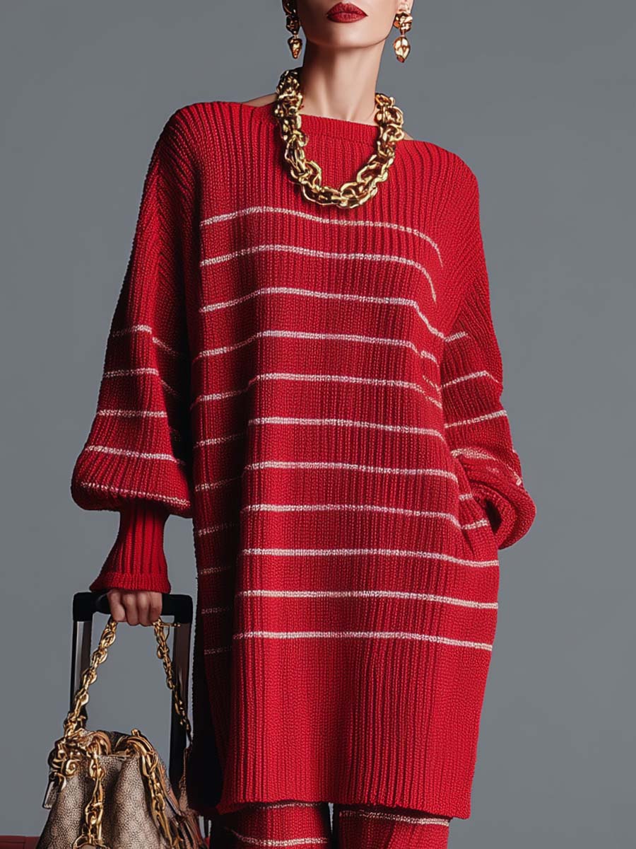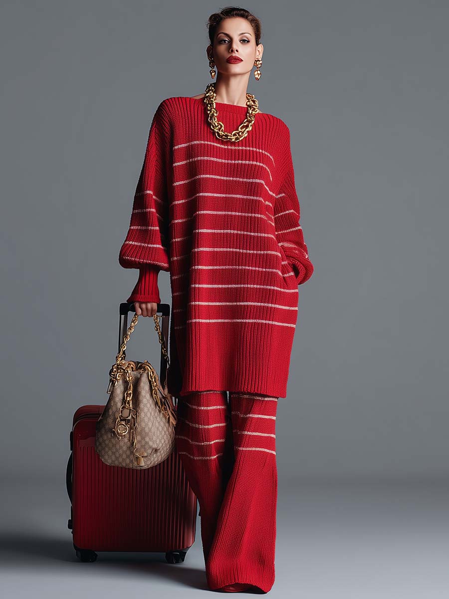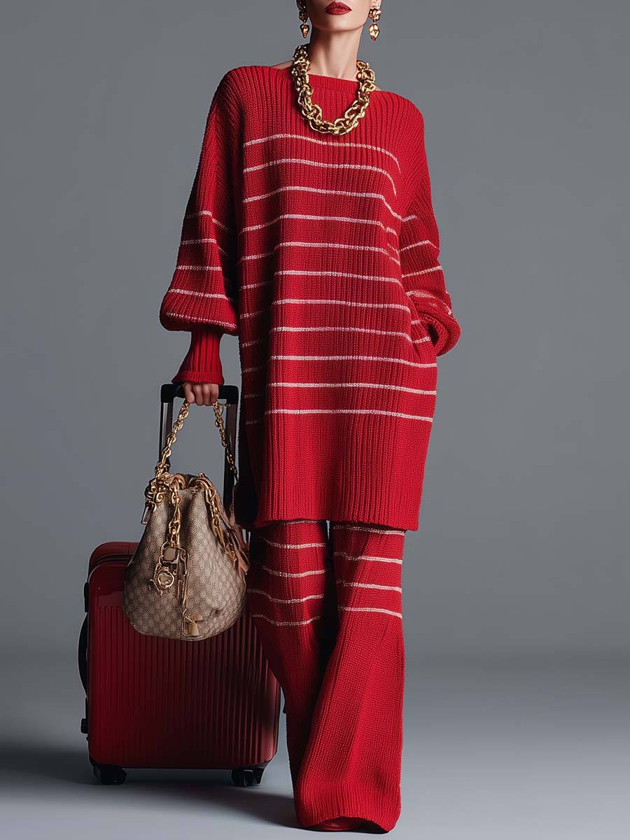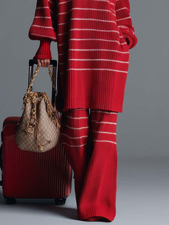 Immerse yourself in the captivating charm of vintage fashion with this striking Red Striped Knitted Top and Pants Set. Crafted to perfection, it uniquely combines modern comfort with a retro edge, making it a must-have addition to your wardrobe. This set is characterized by its vibrant red color paired with eye-catching white stripes, offering a bold and confident look suitable for various occasions.