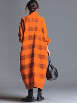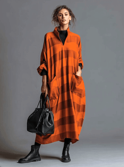 The Vintage Fashion Ultra Loose V-neck Maxi Dress is a stunning blend of orange and brown wide stripes, designed with an ultra-relaxed fit. It features a deep V-neckline and large pockets, which add functionality and a casual elegance to its classic vintage style. The maxi length of the dress creates a elongating silhouette, while the play of stripes adds depth and interest to the overall look.
