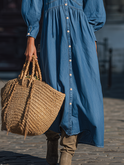 Styling this dress can be both fun and versatile. For a casual look, pair it with sneakers or flat sandals and a crossbody bag for an easygoing, everyday outfit. If you're aiming for a more defined silhouette, consider adding a belt at the waist to balance the dress's loose fit. For a slightly more dressed-up appearance, opt for ankle boots or wedges and accessorize with statement jewelry like chunky bracelets or hoop earrings. A wide-brimmed hat or a structured handbag can add an extra layer of sophistication. Layers such as a lightweight scarf or a cropped jacket complement the dress nicely in cooler weather. The vintage lapel balloon sleeve loose denim dress is an adaptable piece that seamlessly combines comfort with style, making it a delightful addition to any fashion-forward wardrobe.