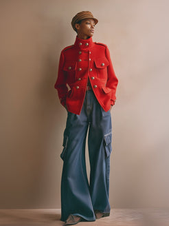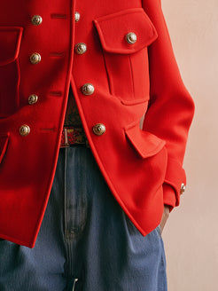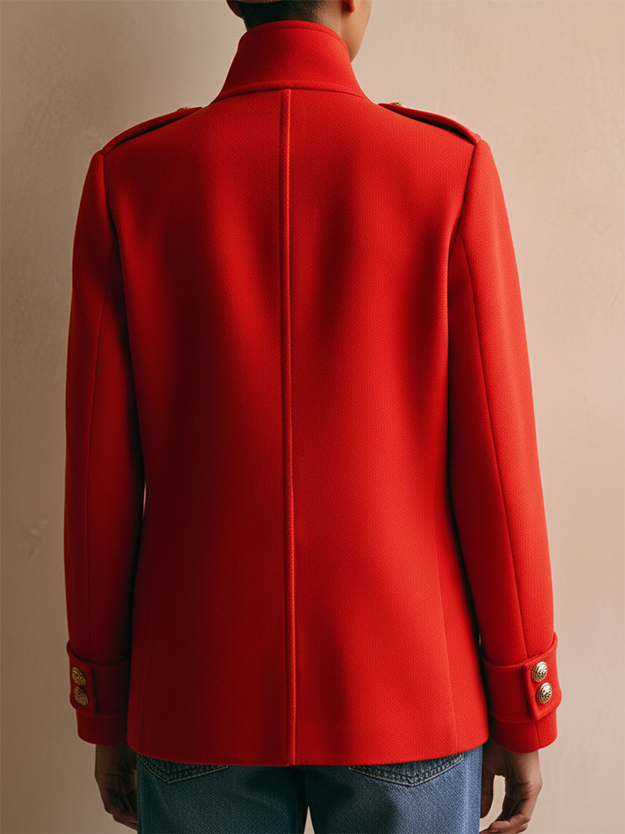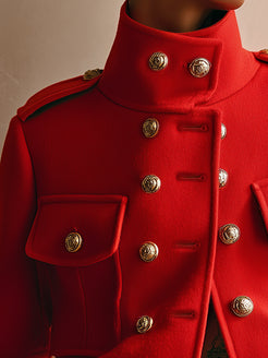The rich red color of the jacket adds a bold pop to any wardrobe, making it an eye-catching statement piece. Whether you're pairing it with a simple blouse and jeans for a chic daytime look or draping it over a cocktail dress for an evening out, this jacket brings an instant touch of class and warmth. The vintage-inspired design with gold button accents ensures that it remains a standout piece for years to come, perfect for anyone who loves combining classic style with a modern twist.