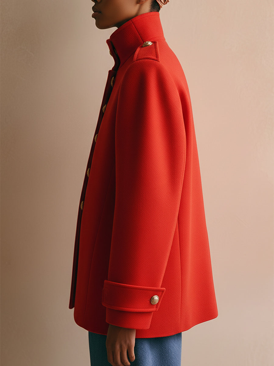 The Vintage Loose Gold Button Red Wool Jacket exudes timeless elegance with a touch of retro charm. Crafted from soft red wool, this jacket features a relaxed, loose fit that offers both comfort and sophistication. The standout gold buttons along the front and on the cuffs add a luxurious, vintage-inspired touch, giving the piece an air of refinement. Its clean lines and slightly oversized shape make it ideal for layering over various outfits, from sleek dresses to tailored pants, allowing it to transition seamlessly between casual and formal settings.