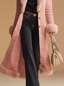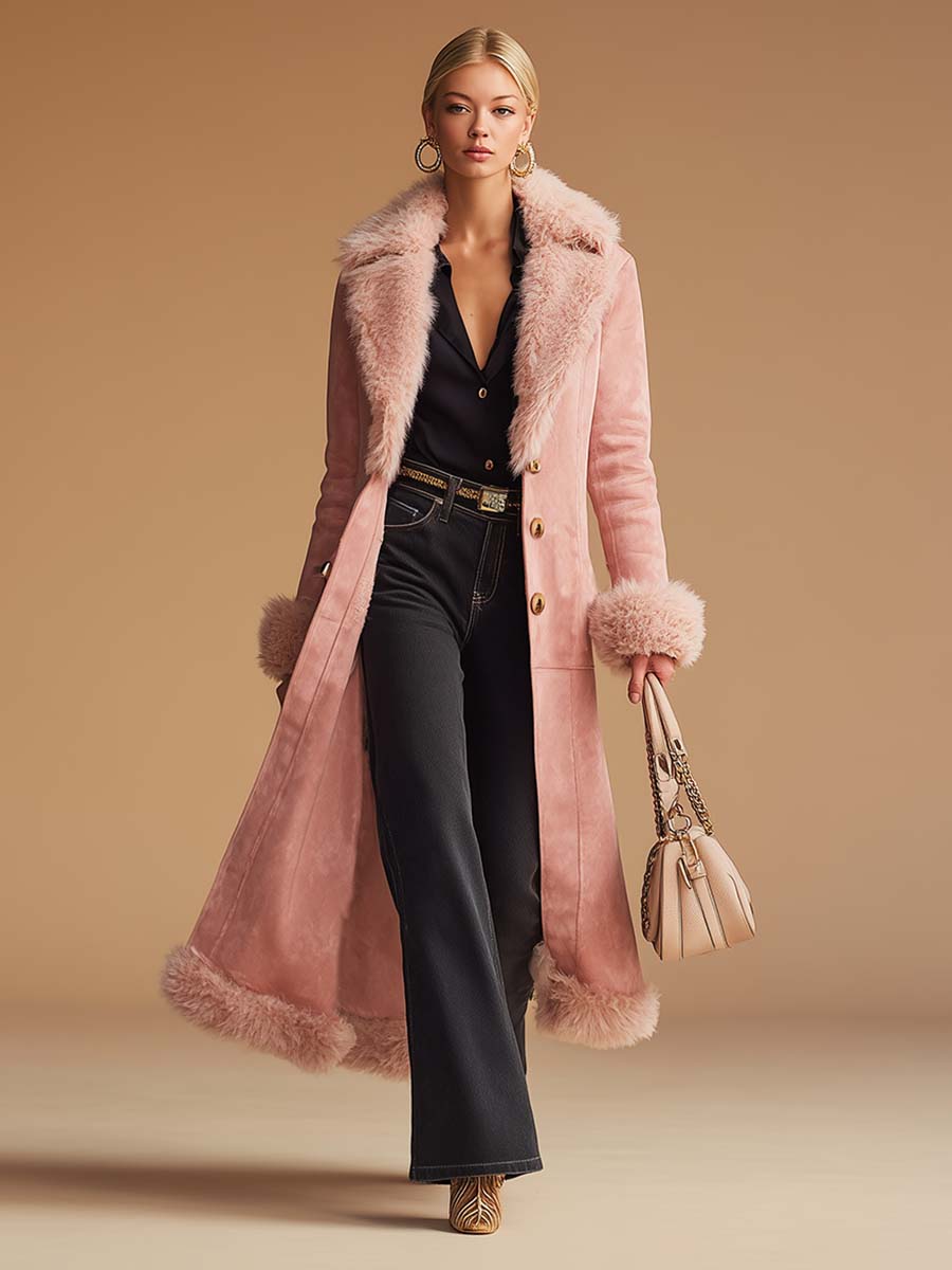 This pink suede coat can be perfectly paired with a variety of outfits. For a casual yet polished look, combine it with skinny jeans and ankle boots. For a more sophisticated appearance, wear it over a sleek dress with heels. Add statement accessories such as a wide-brimmed hat or a leather handbag to complete the look.