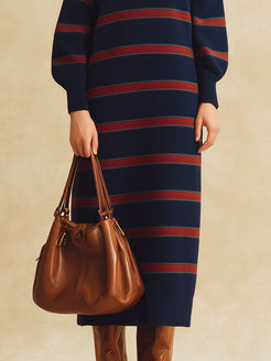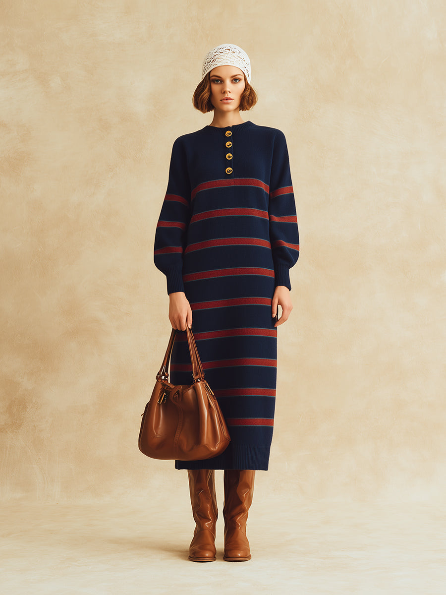 Channeling timeless nautical charm with a vintage twist, this navy knit maxi dress features bold red stripes and a classic crew neckline for an effortlessly chic silhouette. Crafted from a soft, medium-weight knit, it offers just the right amount of stretch and structure to flatter the figure while providing all-day comfort. The ankle-grazing length adds a dramatic, elongating effect, making it perfect for both casual outings and more polished, layered looks.