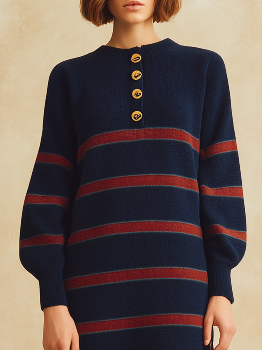 The retro-inspired red striping adds a playful pop of color against the deep navy base, evoking a subtle maritime aesthetic without feeling costume-like. With its long sleeves and understated design, this dress transitions beautifully through the seasons—pair it with sneakers and a denim jacket for daytime, or elevate it with boots and a belt for a more tailored, evening-ready ensemble. It's a wardrobe staple for lovers of vintage fashion with a modern, wearable edge.