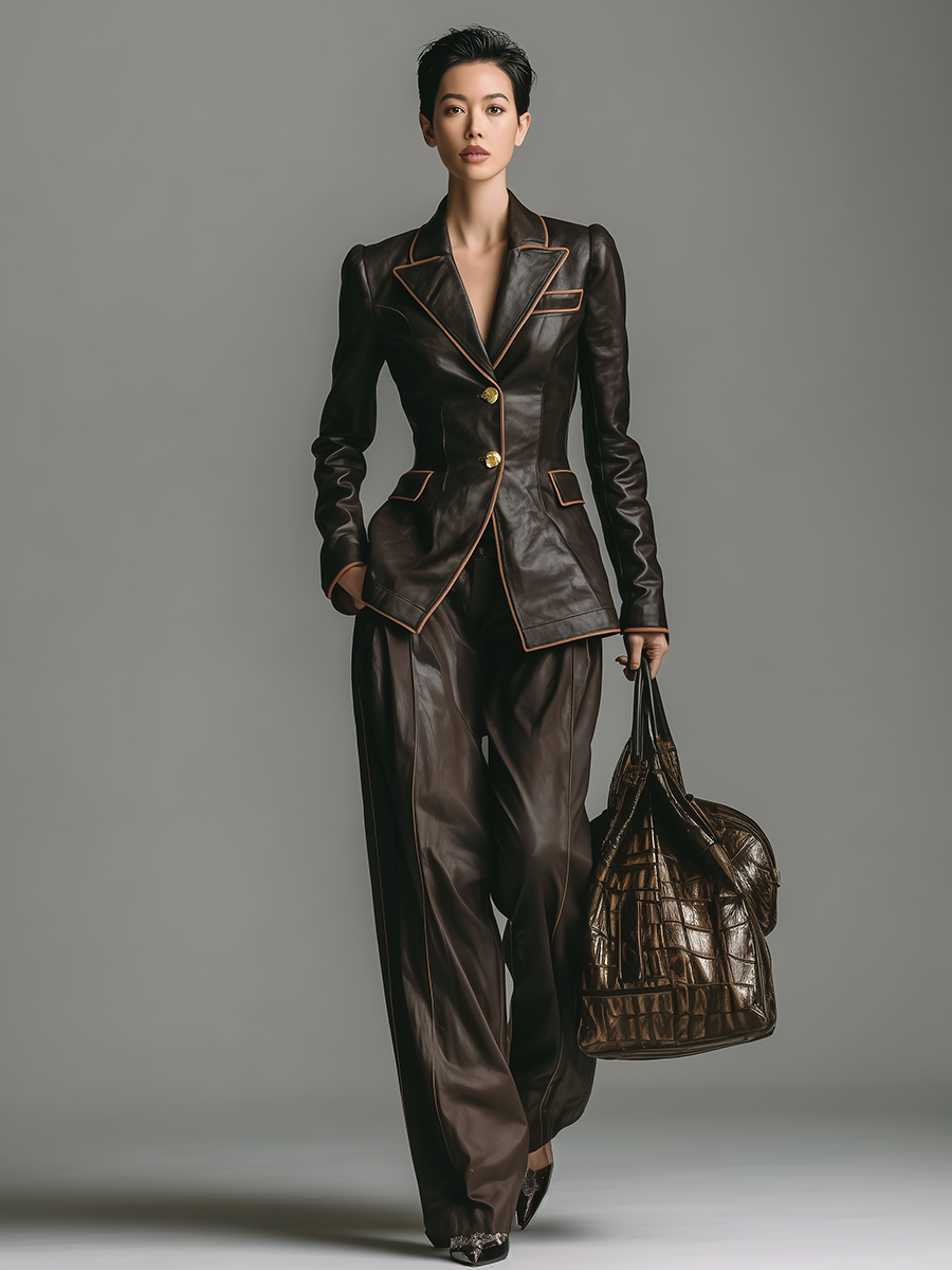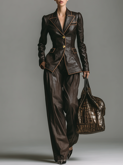 Styling the vintage faux leather suit is both fun and chic. For a polished, professional look, pair the blazer with matching tailored trousers and a crisp white blouse or a sleek turtleneck, finishing with pointed-toe heels or loafers. For a more relaxed yet stylish outfit, wear the suit with a graphic tee and ankle boots, or even dress it down with a cozy knit sweater. Accessories like bold jewelry or a statement belt can add a personal touch and enhance the overall aesthetic. With its blend of classic design and contemporary materials, the vintage single-breasted faux leather suit is a standout choice for anyone looking to make a fashionable impression while enjoying the comfort of premium fabric.