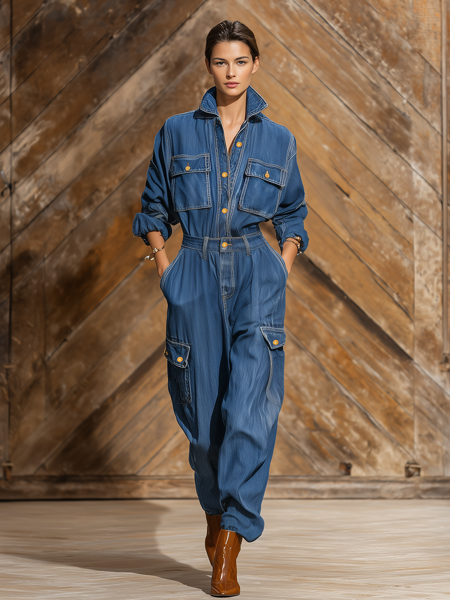 The vintage street style lapel multi-pocket workwear denim jumpsuit is the perfect blend of practicality and contemporary fashion. Made from high-quality, durable denim, this jumpsuit features a stylish lapel collar that adds a touch of sophistication to its utilitarian design. With multiple pockets thoughtfully integrated into the garment, it offers functional storage for essentials while enhancing its overall aesthetic. The relaxed fit ensures comfort and ease of movement, making it an ideal choice for a variety of occasions, from casual outings to more trendy events.