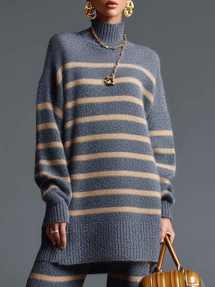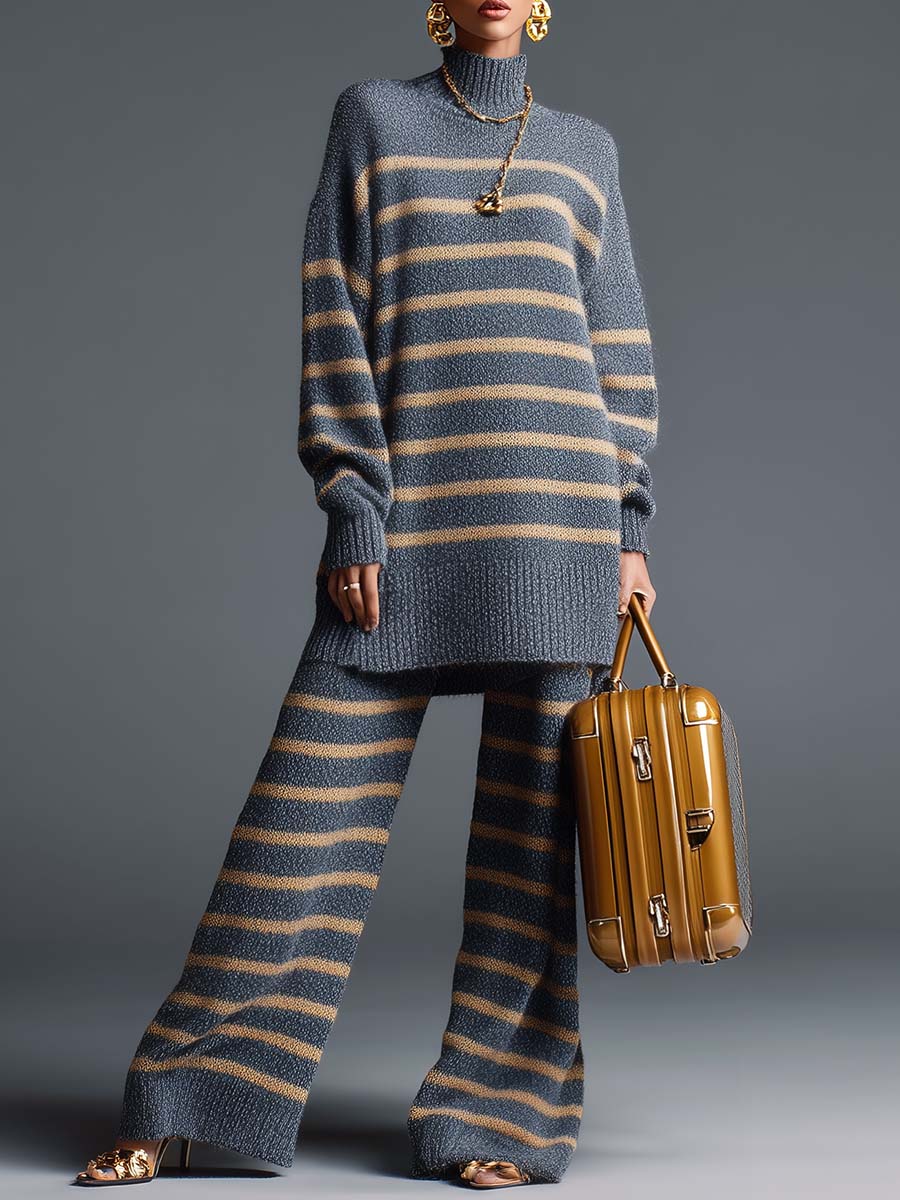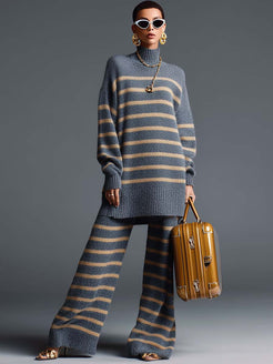 The Vintage Style Street Style High Collar Striped Long Knitted Top And Pants Set is a perfect blend of retro elegance and modern street fashion. Crafted with attention to detail, this ensemble promises comfort without compromising on style.
