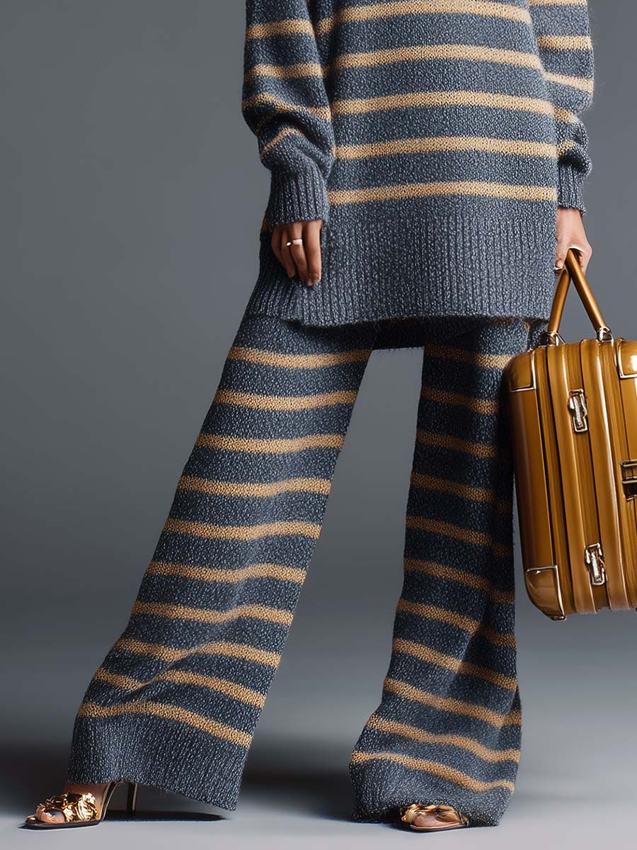 2.Design: The set consists of a long-sleeve, high-collar top paired with matching pants, both adorned with classic stripes that add a timeless touch to the modern knitted texture.