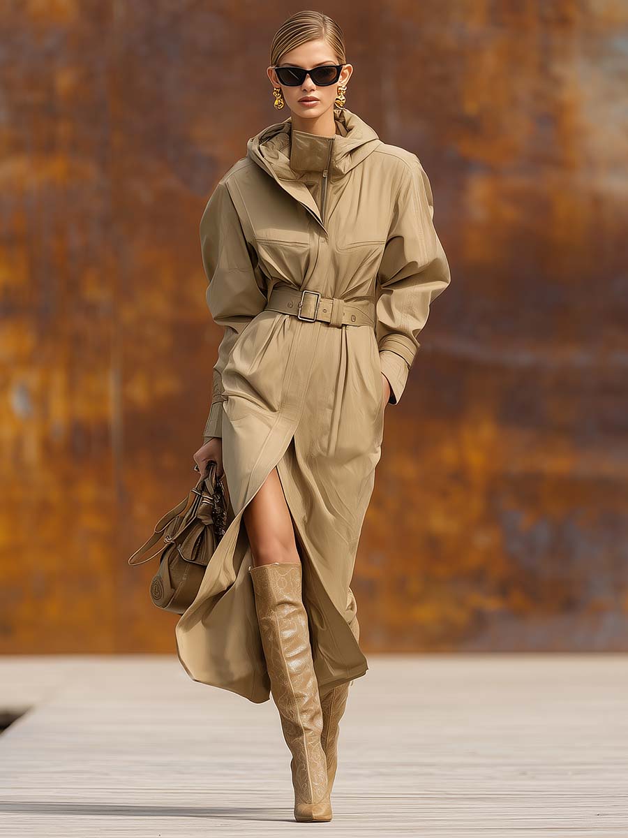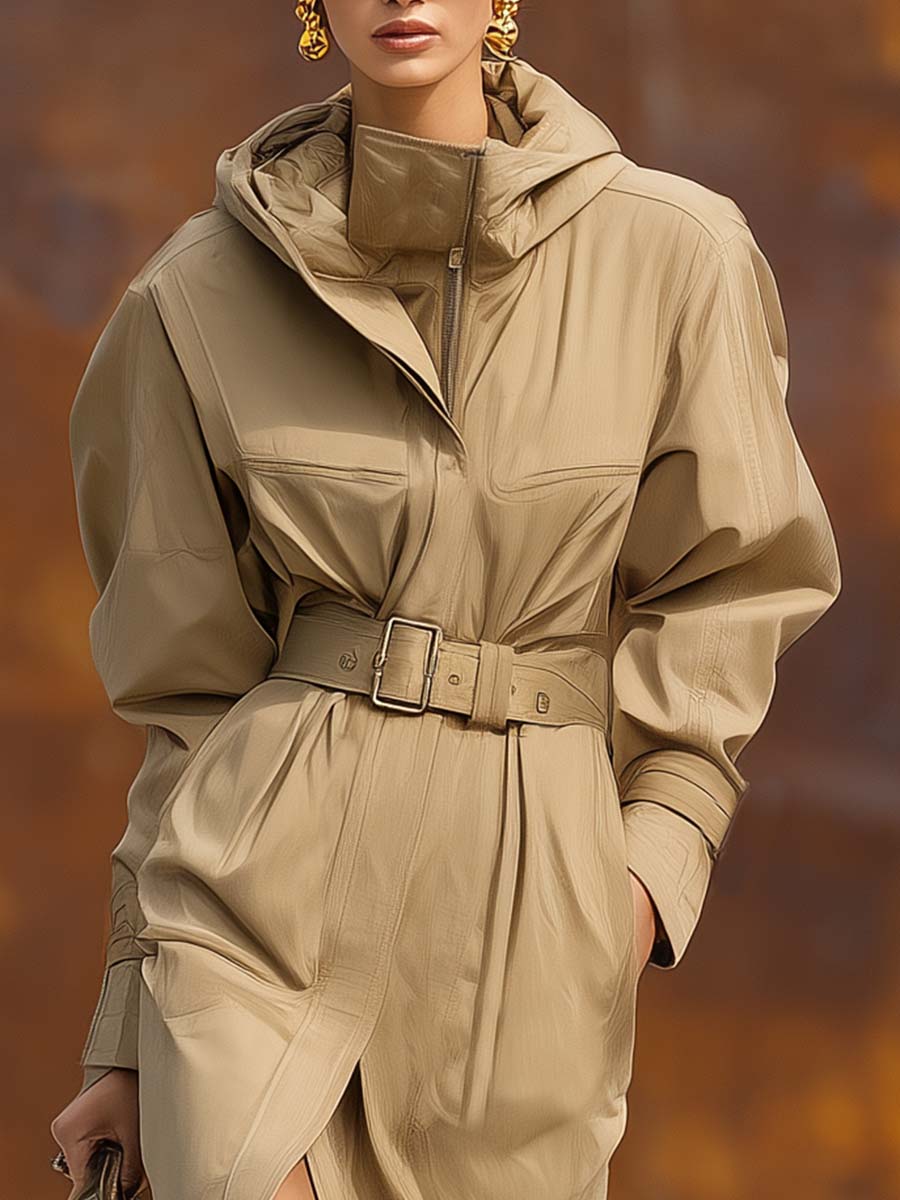 This khaki trench coat is a perfect blend of vintage allure and modern style. Crafted with a stand collar and a convenient hood, it offers protection against the weather while maintaining a chic look. The front zipper closure ensures easy wear, complemented by a belt that cinches the waist, enhancing the trench coat's elegant silhouette.