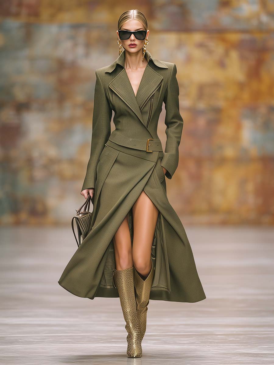 This stunning vintage-inspired trench coat maxi dress effortlessly blends classic style with modern elements. The khaki green hue adds a touch of sophistication, while the slant lapel collar and slit design offer a unique twist. Perfect for both urban street style and graceful evening looks, this dress is set to be a timeless addition to your wardrobe.