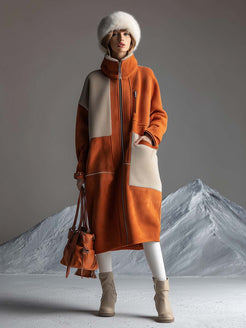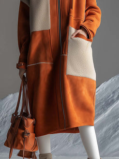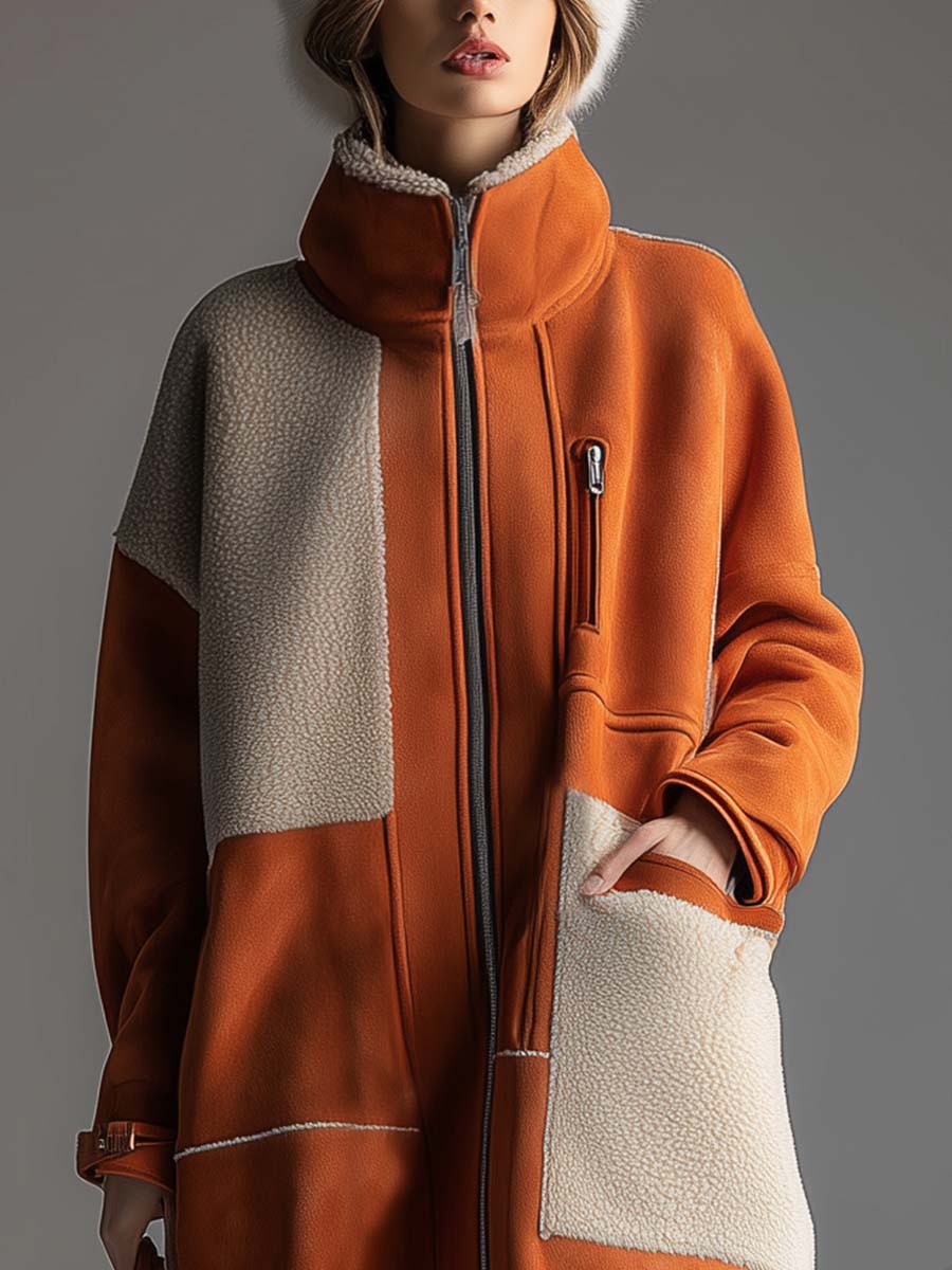 Embrace a sense of vintage Western charm with this coat, which perfectly marries the warmth of polar fleece with the distinct texture of orange suede accents. The beige backdrop serves as a sophisticated canvas, bringing out the rich orange tones for an eye-catching contrast. The lapel front zipper design ensures not only functionality but also adds an element of stylish flair to the overall aesthetic.