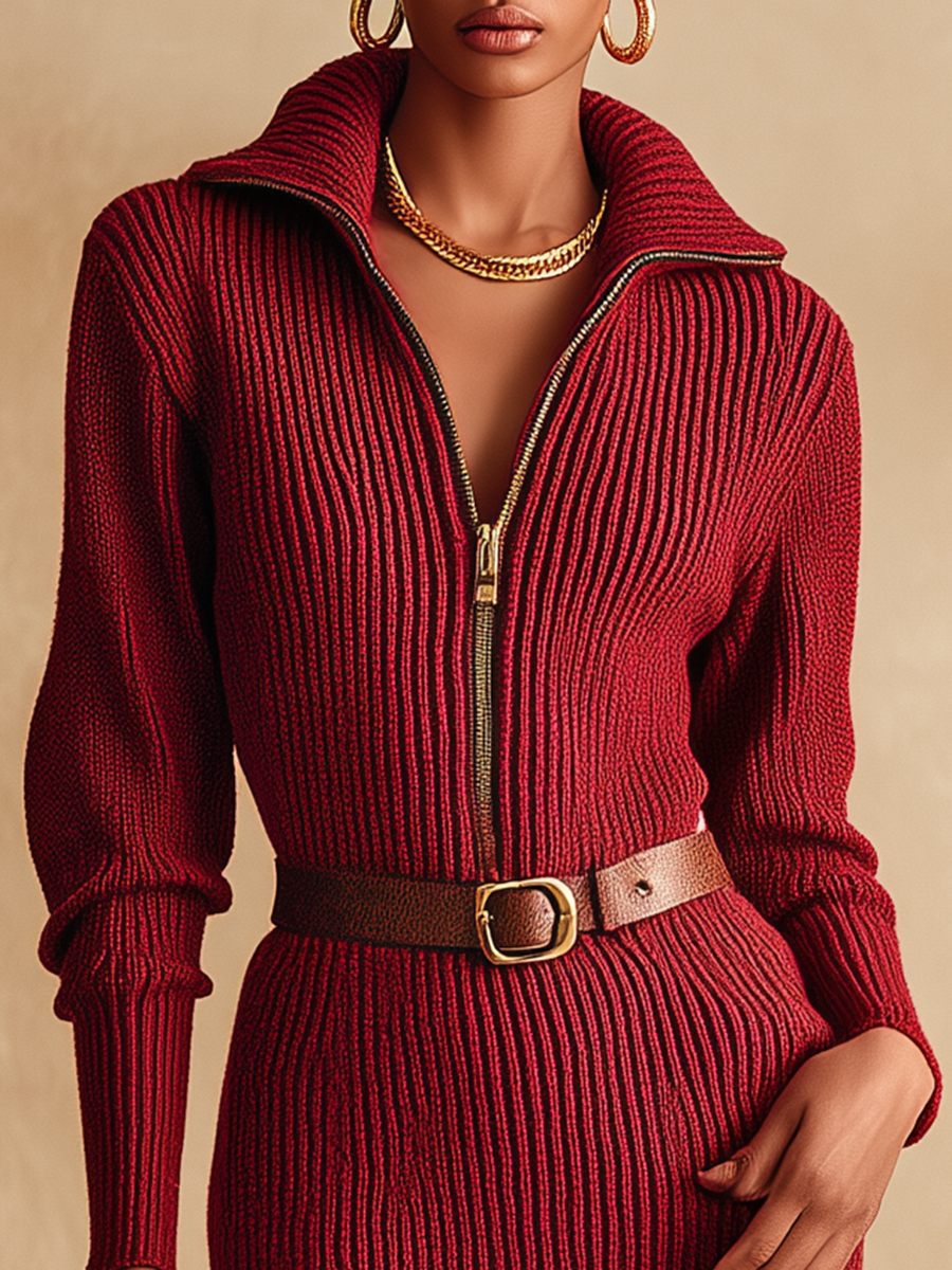 The vintage zipper lapel long-sleeved knitted dress is a stylish piece that blends nostalgic design elements with contemporary functionality. This dress offers the cozy comfort of knit fabric, making it an ideal choice for cooler weather, while its long sleeves provide additional warmth and coverage. The zipper detail adds a modern twist, allowing for adjustable necklines, while the lapel introduces a classic element reminiscent of tailored styles. Together, these features create a versatile dress that is both chic and practical.